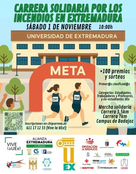 Desde la Universidad de Extremadura a través de Vive la UEx! y en colaboración con el Consejo de Estudiantes, SAFYDE, Alianza Extremadura es Futuro, Consejo Social junto a varias instituciones y empresas, se ha organizado esta II carrera solidaria de la UEx Este sábado 1 de noviembre, súmate a la carrera solidaria por los incendios en Extremadura. Puedes participar: